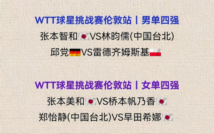 全主力出战伦敦站的日本队,在单打战线收获颇丰。女单3人进4强,男单张本智和亦是夺冠最大热门。